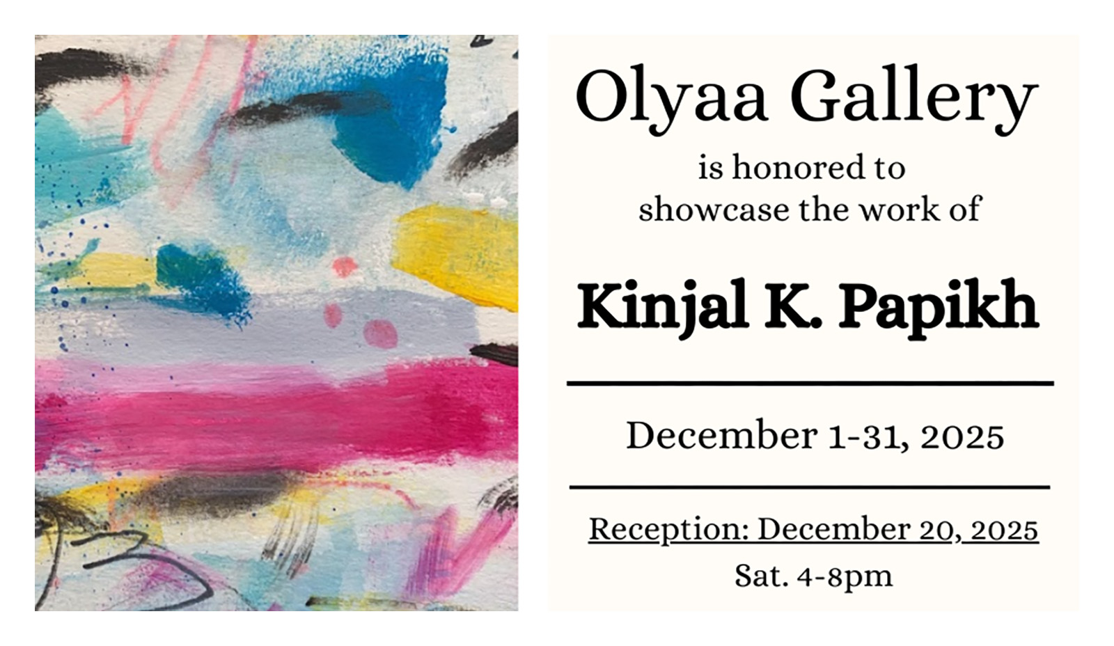 OLYAA Gallery is honored to present a solo exhibition by Kinjal K. Papikh, showcasing a vibrant collection of abstract works throughout December 2025. This exhibition highlights Papikh’s expressive use of color, movement, and layered textures, offering viewers an immersive visual experience rooted in emotion and spontaneity.